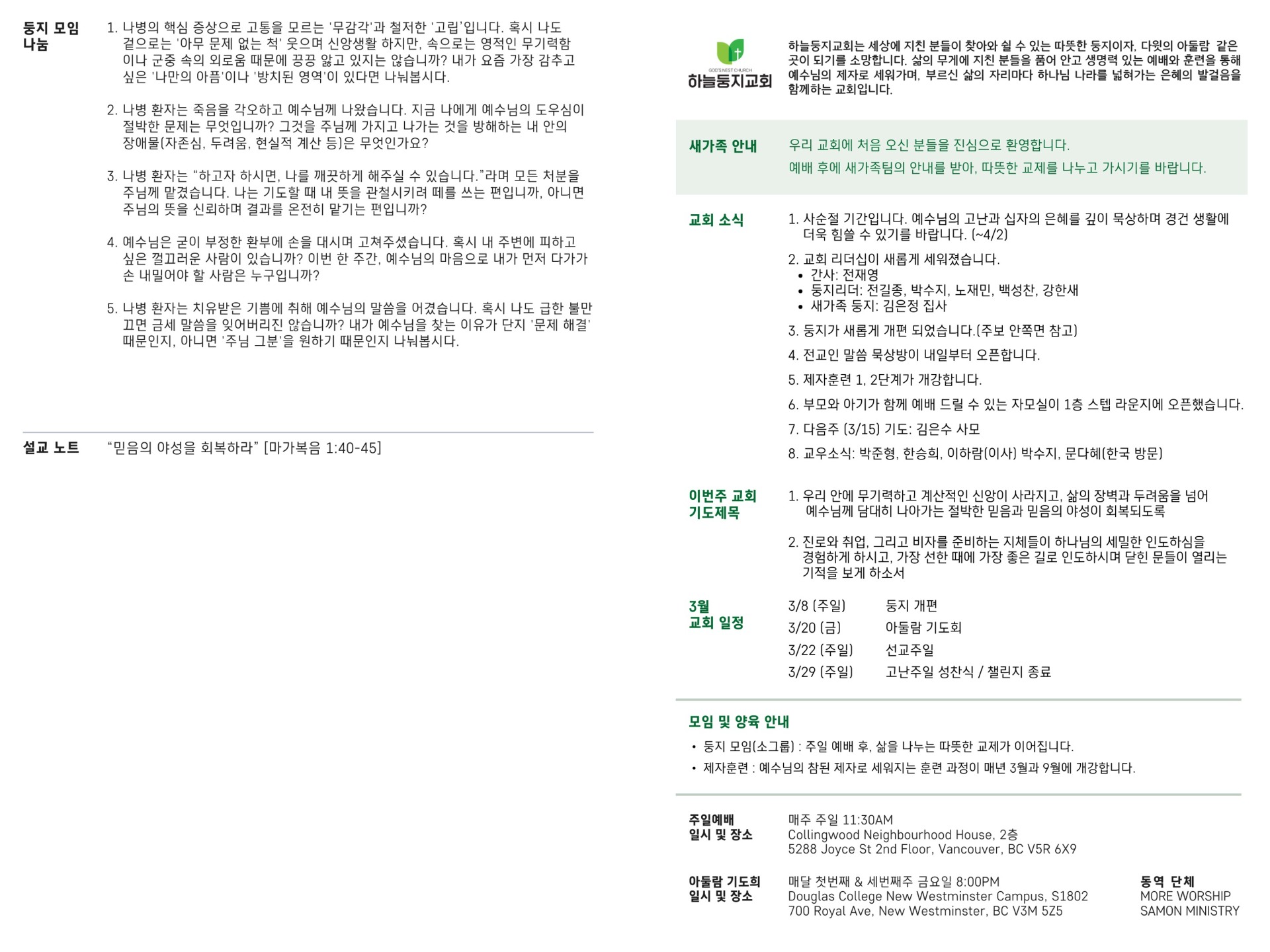 우리 안에 무기력하고 계산적인 신앙이 사라지고, 삶의 장벽과 두려움을 넘어 예수님께 담대히 나아가는 절박한 믿음과 믿음의 야성이 회복되도록